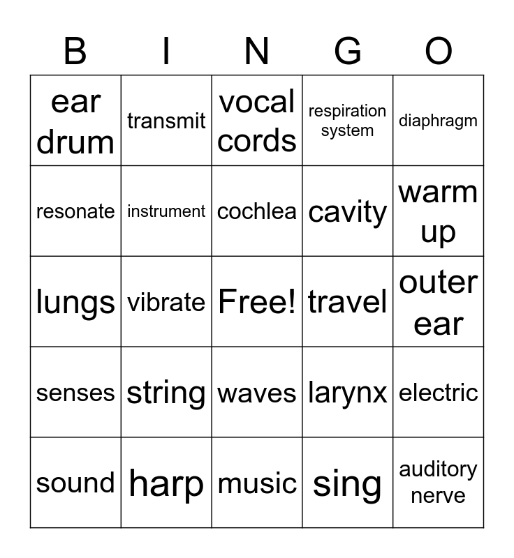 This bingo card has a free space and 29 words: sound, voice, vibrate, hear, ear drum, vocal cords, instrument, string, travel, harp, outer ear, auditory nerve, music, sing, warm up, muscles, waves, senses, diaphragm, lungs, larynx, hum, cavity, resonate, respiration system, transmit, electric, cochlea and somato-sensory system.