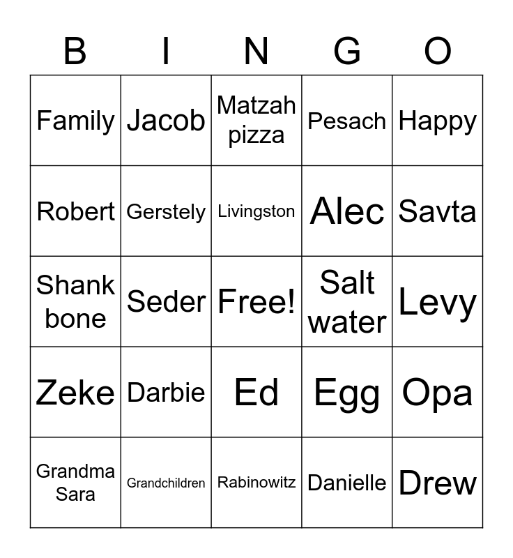 This bingo card has a free space and 24 words: Darbie, Grandchildren, Livingston, Grandma Sara, Happy, Family, Robert, Jacob, Salt water, Ed, Alec, Shank bone, Egg, Opa, Gerstely, Danielle, Levy, Matzah pizza, Savta, Seder, Drew, Zeke, Pesach and Rabinowitz.