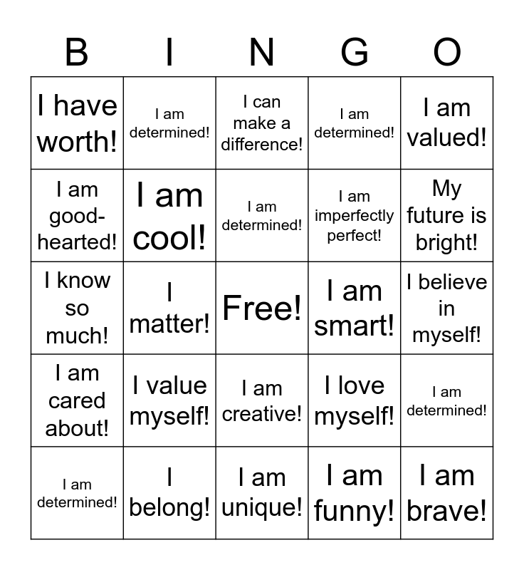 This bingo card has a free space and 29 words: I am determined!, I am strong!, I matter!, I am loved!, I have worth!, I can make a difference!, I am cool!, I value myself!, I am smart!, I belong!, I believe in myself!, I am brave!, I am unique!, I am funny!, My future is bright!, I am beautiful!, I am creative!, I am cared about!, I am valued!, I know so much!, I love myself!, I am awesome!, I am imperfectly perfect!, I am good-hearted!, I am determined!, I am determined!, I am determined!, I am determined! and I am determined!.