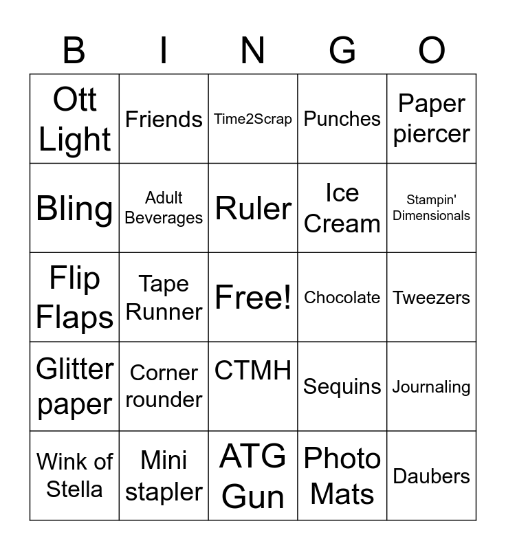 This bingo card has a free space and 24 words: Corner rounder, Mini stapler, Ruler, Wink of Stella, Paper piercer, Ott Light, Bling, Friends, Chocolate, CTMH, Ice Cream, Flip Flaps, Sequins, Journaling, Adult Beverages, Photo Mats, Tweezers, Time2Scrap, Stampin' Dimensionals, Tape Runner, Daubers, Glitter paper, Punches and ATG Gun.