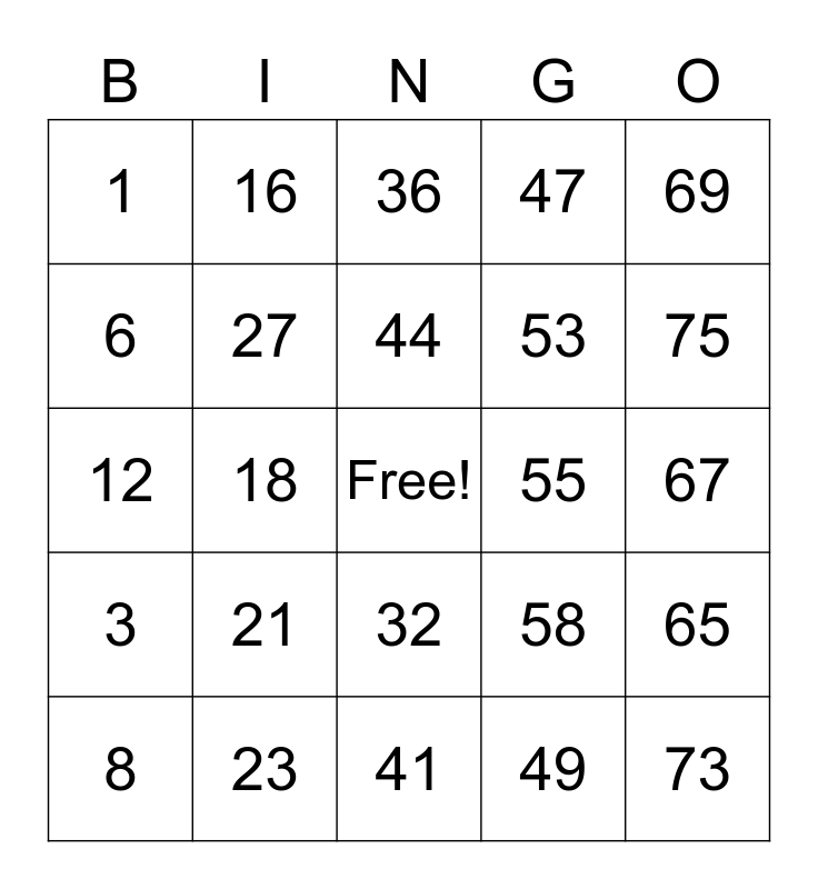 This bingo card has a free space and 24 words: 8, 21, 44, 49, 69, 1, 16, 36, 55, 67, 12, 27, 58, 65, 6, 23, 41, 47, 75, 3, 18, 32, 53 and 73.