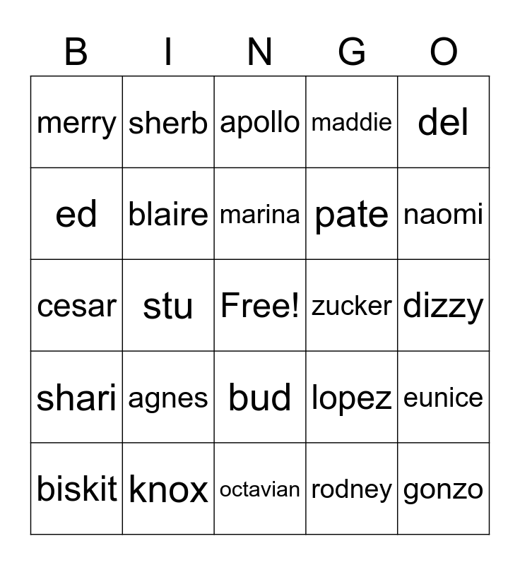 This bingo card has a free space and 24 words: agnes, knox, marina, biskit, del, merry, ed, sherb, zucker, bud, pate, cesar, lopez, eunice, blaire, rodney, dizzy, apollo, naomi, stu, gonzo, shari, maddie and octavian.