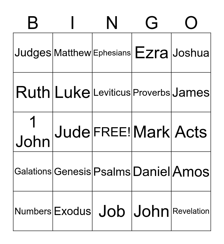 This bingo card has a free space and 24 words: Genesis, Exodus, Leviticus, Numbers, Joshua, Judges, Ruth, Matthew, Mark, Psalms, Proverbs, 1 John, Daniel, Amos, Luke, John, Acts, Ephesians, James, Jude, Revelation, Galations, Ezra and Job.