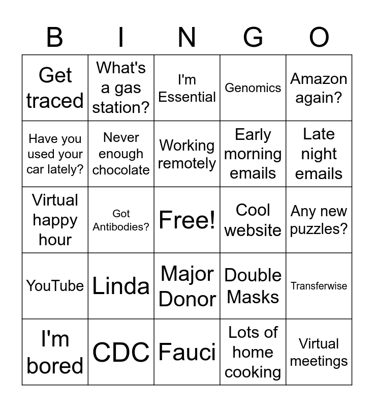 This bingo card has a free space and 75 words: Gotta Laugh, Can't sleep, I'm Essential, Thank a Nurse, What day is it?, Are you on Mute?, My internet went out, My electricity went out, Get Vaccinated, I need a hair cut, Social Distancing, Ordered take out food, Working remotely, Have you used your car lately?, What is a market?, Got Antibodies?, Wash your hands, Virtual meetings, Zoom fatigue, Amazon again?, Charity Engine, Virtual happy hour, Never enough chocolate, What's a gas station?, Genomics, Proteomics, Long COVID, Post COVID, Long Haulers, New President, Miss going to the movies, Got a good book?, Disposable Mask, Double Masks, Late night emails, Early morning emails, 6 feet apart, Wear your mask people, Any new puzzles?, Lots of home cooking, Air Hugs, Corona who?, Variant from where?, When can I leave my house?, Reopening, Outdoor dining, I'm bored, Get traced, Safer at home, May Momentum, Triple Tuesday, Major Donor, Need a million, Andrew, Kathleen, Heather, Kimberly, Debby, Janis, Lynn, Linda, Chris, Happy Birthday, Audits, Rebecca, Cool website, What is a CRC?, Canada, Australia, Transferwise, YouTube, CDC, Maureen, Fauci and NIH.