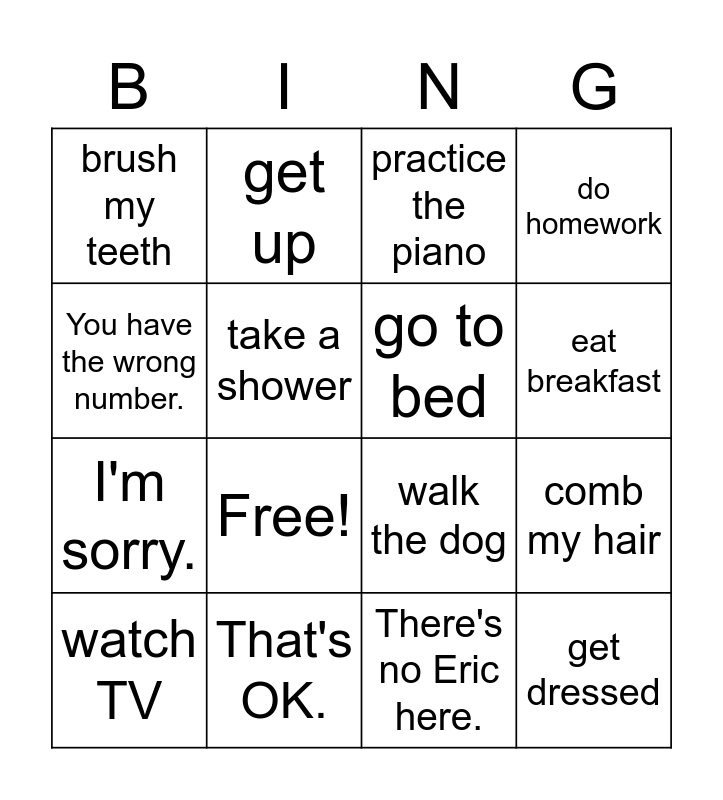 This bingo card has 18 words: Free!, get dressed, practice the piano, brush my teeth, walk the dog, do homework, watch TV, get up, eat breakfast, I'm sorry., There's no Eric here., You have the wrong number., comb my hair, take a shower, go to bed, listen to music, That's OK. and Can I speak to Bella?.