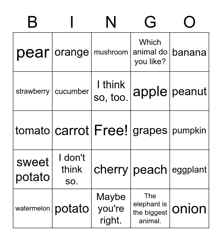 This bingo card has a free space and 25 words: I don't think so., Maybe you're right., I think so, too., watermelon, banana, pear, strawberry, orange, grapes, cherry, apple, tomato, peach, eggplant, cucumber, bean, pumpkin, mushroom, peanut, carrot, onion, potato, sweet potato, Which animal do you like? and The elephant is the biggest animal..
