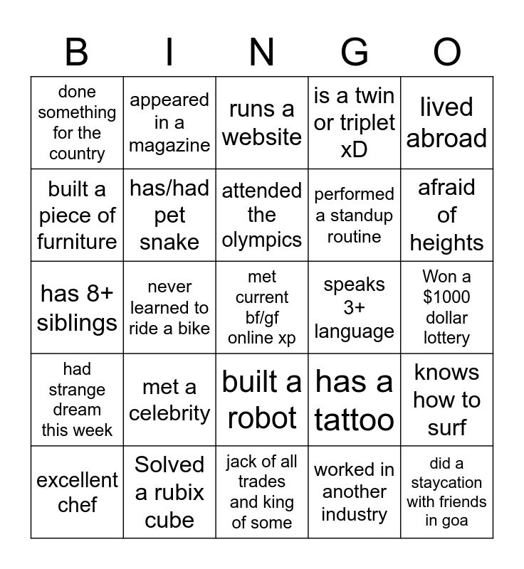This bingo card has a free space and 24 words: met a celebrity, Solved a rubix cube, attended the olympics, excellent chef, lived abroad, done something for the country, built a piece of furniture, appeared in a magazine, speaks 3+ language, built a robot, performed a standup routine, has 8+ siblings, has a tattoo, knows how to surf, has/had pet snake, worked in another industry, Won a $1000 dollar lottery, runs a website, afraid of heights, never learned to ride a bike, did a staycation with friends in goa, had strange dream this week, is a twin or triplet xD and jack of all trades and king of some.
