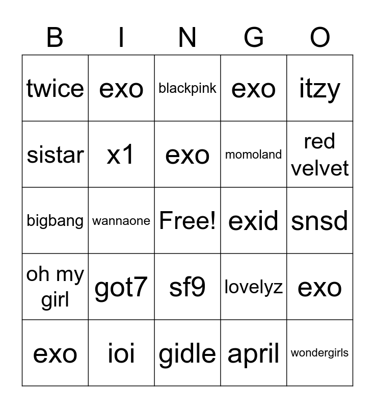 This bingo card has a free space and 29 words: exo, izone, wannaone, clc, twice, blackpink, x1, got7, exid, ioi, snsd, wondergirls, gidle, april, red velvet, 2ne1, sf9, oh my girl, itzy, bigbang, lovelyz, the rose, momoland, sistar, exo, exo, exo, exo and exo.