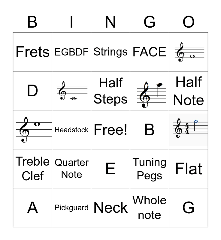 This bingo card has 6 images, a free space and 23 words: A, Sound Hole, Headstock, Rest, Frets, Strings, Quarter Note, B, Pickguard, G, Neck, Whole note, Half Note, E, Treble Clef, Tuning Pegs, Pick, D, FACE, EGBDF, Flat, Half Steps and Sharp.