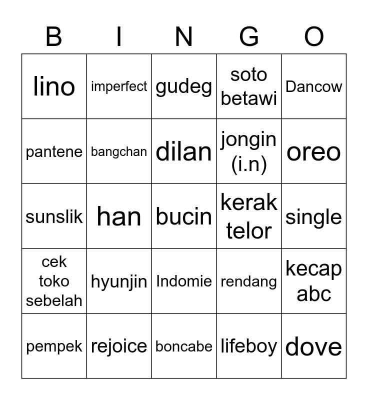 This bingo card has a free space and 24 words: hyunjin, rejoice, dilan, pempek, Dancow, lino, pantene, imperfect, kerak telor, Indomie, jongin (i.n), sunslik, rendang, kecap abc, bangchan, lifeboy, single, gudeg, oreo, han, dove, cek toko sebelah, soto betawi and boncabe.