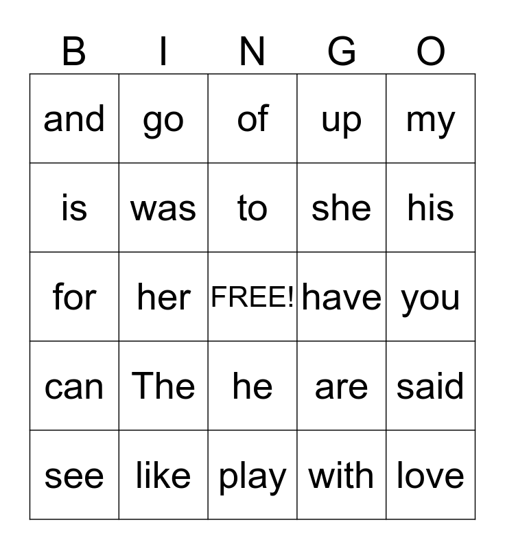 This bingo card has a free space and 24 words: The, like, to, see, my, and, is, go, have, he, she, for, are, said, was, with, you, of, his, her, love, can, up and play.
