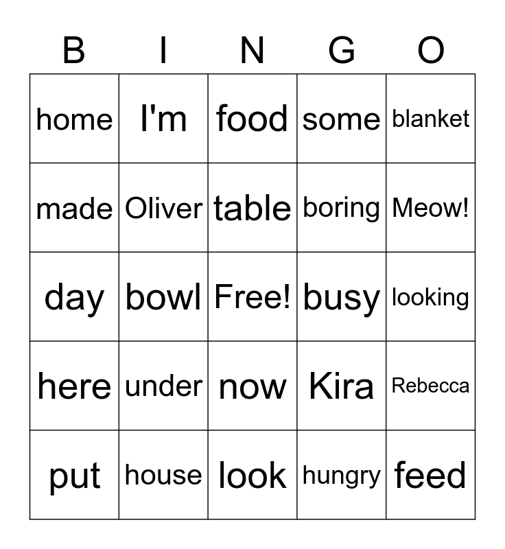 This bingo card has a free space and 24 words: under, house, table, put, blanket, home, made, I'm, busy, now, boring, day, Kira, Rebecca, Oliver, hungry, looking, food, Meow!, bowl, feed, here, some and look.