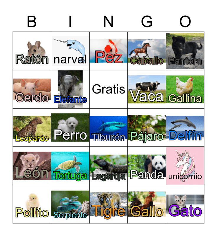 This bingo card has 28 images and 29 words: Pollito, Conejo, Perro, Gato, Ratón, Pez, Elefante, Tortuga, Pájaro, Serpiente, Delfín, Tiburón, Tigre, Gallo, Gallina, Oso, Lagartija, León, Pantera, Leopardo, Panda, Jirafa, Vaca, Cerdo, Caballo, narval, unicornio, Gratis and lobo.