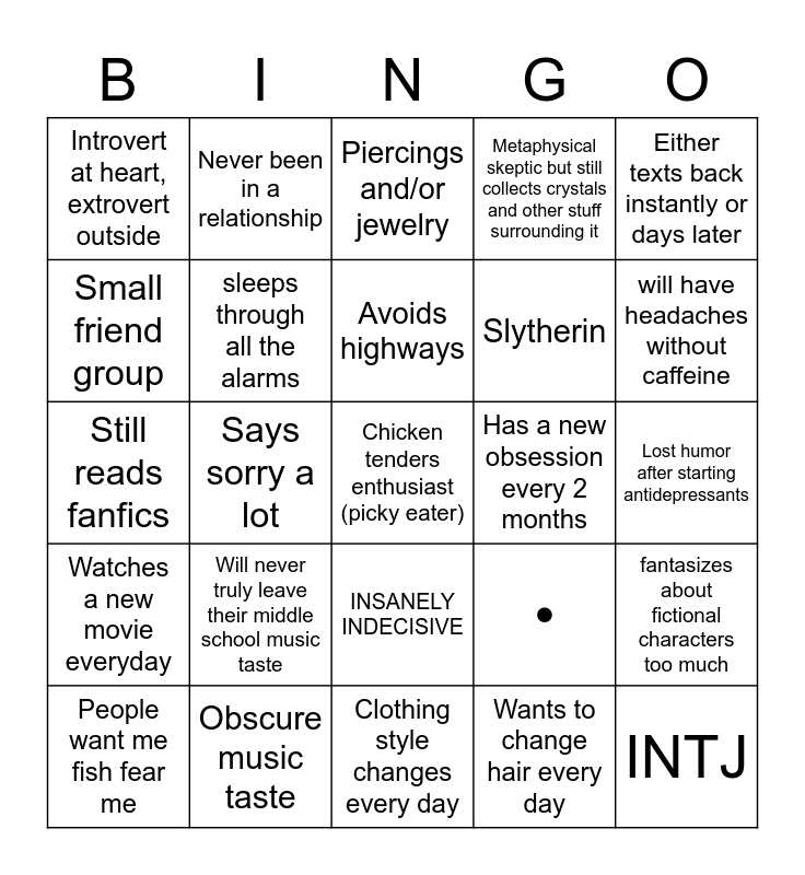 This bingo card has 25 words: Will never truly leave their middle school music taste, Clothing style changes every day, Avoids highways, People want me fish fear me, Either texts back instantly or days later, Introvert at heart, extrovert outside, Small friend group, Never been in a relationship, Has a new obsession every 2 months, INSANELY INDECISIVE, Slytherin, Still reads fanfics, •, fantasizes about fictional characters too much, sleeps through all the alarms, INTJ, Lost humor after starting antidepressants, Piercings and/or jewelry, will have headaches without caffeine, Says sorry a lot, Chicken tenders enthusiast (picky eater), Obscure music taste, Watches a new movie everyday, Metaphysical skeptic but still collects crystals and other stuff surrounding it and Wants to change hair every day.