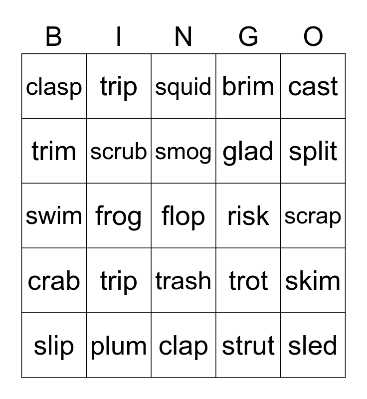 This bingo card has a free space and 24 words: trip, plum, smog, slip, cast, clasp, trim, trip, risk, trash, glad, swim, trot, skim, scrub, strut, scrap, squid, split, frog, sled, crab, brim and clap.