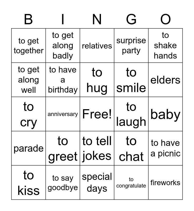 This bingo card has a free space and 24 words: to greet, to say goodbye, to hug, to kiss, to shake hands, to get together, to get along well, to get along badly, to laugh, to tell jokes, to smile, to cry, to chat, to have a picnic, to have a birthday, to congratulate, baby, relatives, elders, anniversary, fireworks, parade, surprise party and special days.