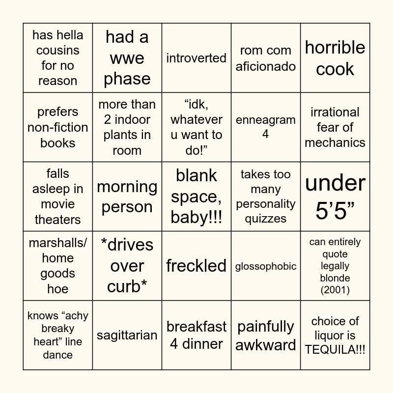 This bingo card has a free space and 24 words: *drives over curb*, sagittarian, “idk, whatever u want to do!”, knows “achy breaky heart” line dance, horrible cook, has hella cousins for no reason, prefers non-fiction books, had a wwe phase, takes too many personality quizzes, freckled, enneagram 4, falls asleep in movie theaters, glossophobic, can entirely quote legally blonde (2001), more than 2 indoor plants in room, painfully awkward, under 5’5”, introverted, irrational fear of mechanics, morning person, choice of liquor is TEQUILA!!!, marshalls/ home goods hoe, rom com aficionado and breakfast 4 dinner.