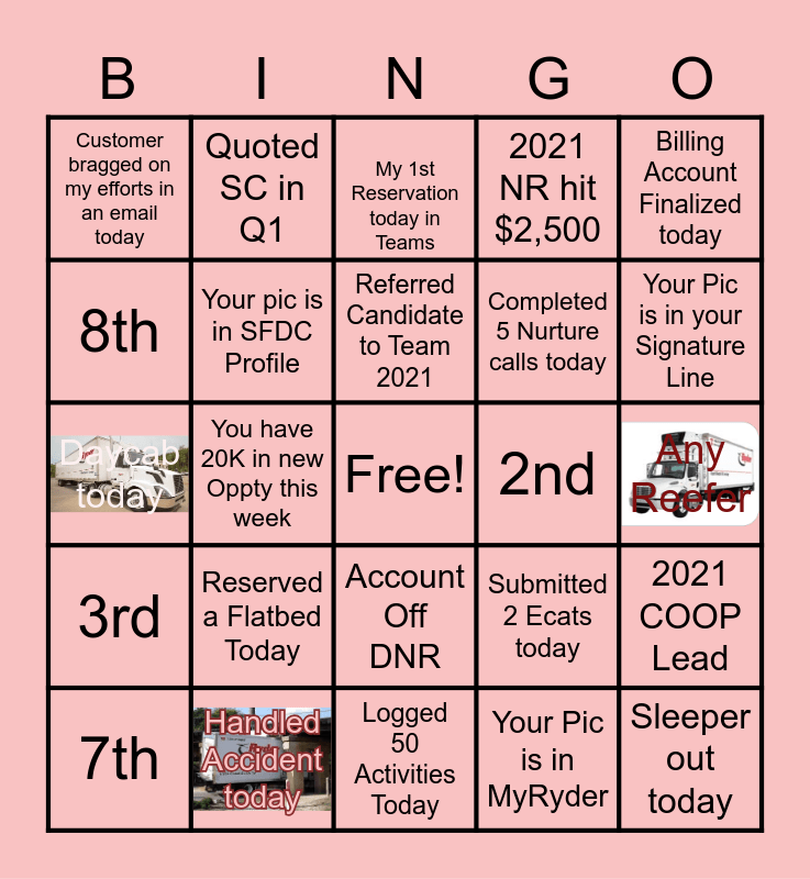 This bingo card has 3 images, a free space and 29 words: 7th, 6th, You have 20K in new Oppty this week, 5th, Customer bragged on my efforts in an email today, My 1st Reservation today in Teams, Your pic is in SFDC Profile, Reserved a Flatbed Today, 2nd, Handled Accident today, Any Reefer, Sleeper out today, Logged 50 Activities Today, Your Pic is in MyRyder, Your Pic is in your Signature Line, 4th, Account Off DNR, 3rd, Billing Account Finalized today, Daycab today, Submitted 2 Ecats today, Helped A Teammate Today, Completed 5 Nurture calls today, 8th, 2021 NR hit $2,500, Quoted SC in Q1, 2021 COOP Lead, Referred Candidate to Team 2021 and Copied RM on Thank you to counter today.