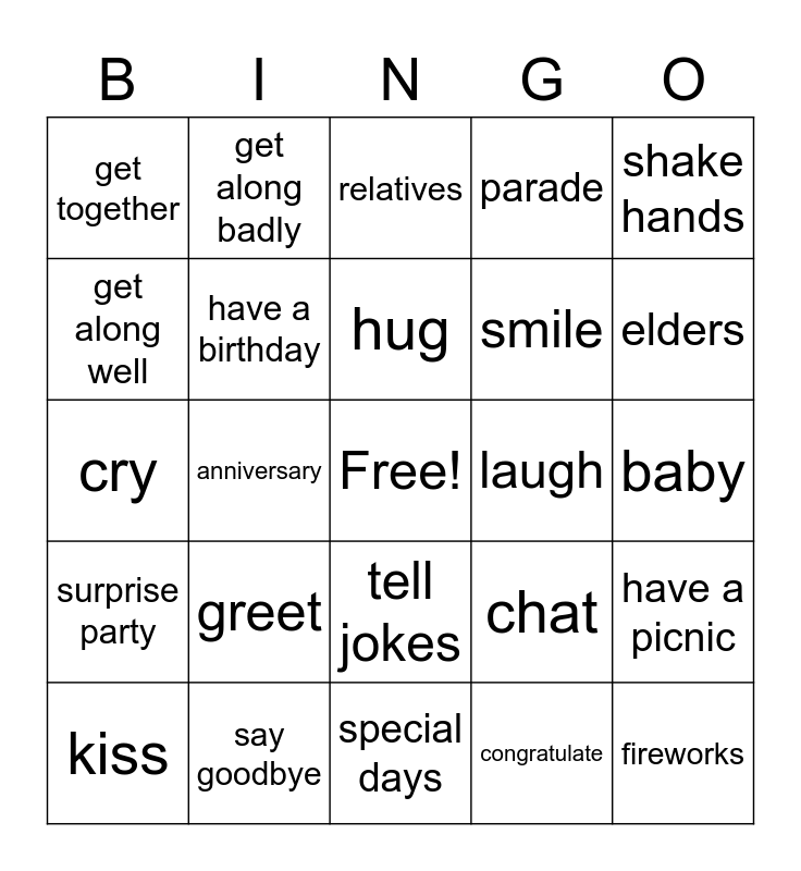 This bingo card has a free space and 24 words: greet, say goodbye, hug, kiss, shake hands, get together, get along well, get along badly, laugh, tell jokes, smile, cry, chat, have a picnic, have a birthday, congratulate, baby, relatives, elders, anniversary, fireworks, surprise party, parade and special days.