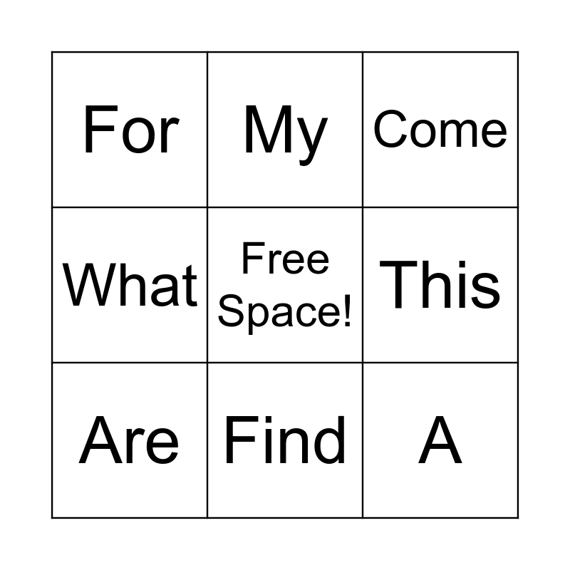 This bingo card has a free space and 17 words: Like, I, Come, For, Go, What, With, Are, Find, This, You, Will, A, My, Can, And and Was.