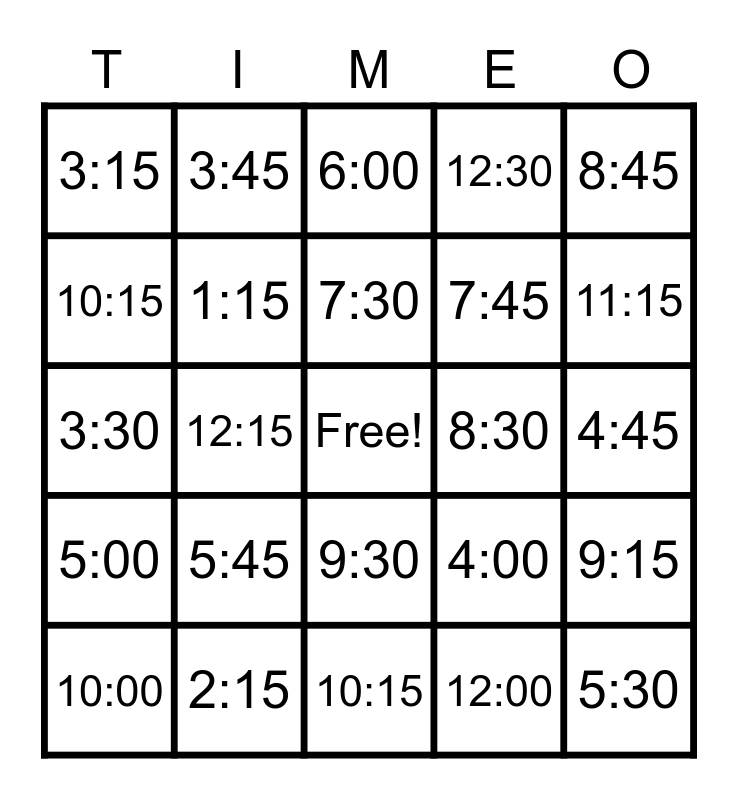 This bingo card has a free space and 29 words: 10:00, 11:30, 12:15, 9:45, 3:15, 6:00, 1:15, 5:45, 8:30, 2:15, 4:45, 5:30, 10:15, 12:00, 11:15, 6:45, 9:30, 5:00, 8:45, 3:30, 4:00, 1:00, 7:45, 10:15, 12:30, 3:45, 9:15, 7:30 and 3:00.