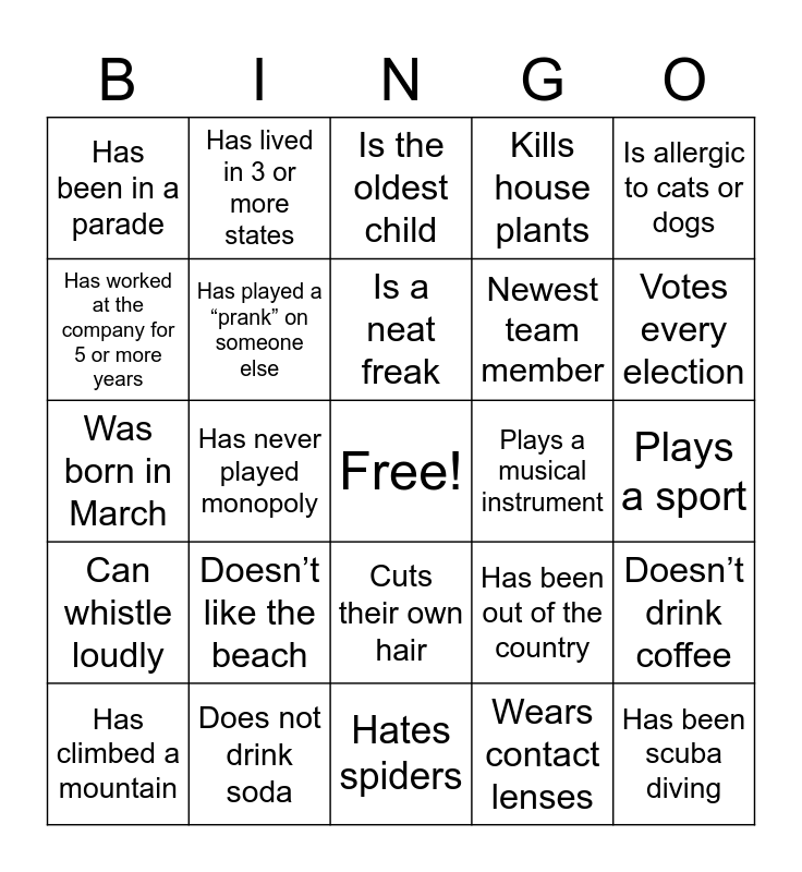 This bingo card has a free space and 30 words: Does not drink soda, Has 2 or more pets, Has never played monopoly, Speaks another language, Has been in a parade, Is the oldest child, Has played a “prank” on someone else, Cuts their own hair, Plays a musical instrument, Hates spiders, Plays a sport, Has been scuba diving, Wears contact lenses, Checks social media daily, Votes every election, Has caught a fish, Has been out of the country, Can whistle loudly, Doesn’t like the beach, Is allergic to cats or dogs, Was born in March, Loves to cook, Has lived in 3 or more states, Newest team member, Has worked at the company for 5 or more years, Kills house plants, Doesn’t drink coffee, Has climbed a mountain, Is a neat freak and Belongs to a book club.