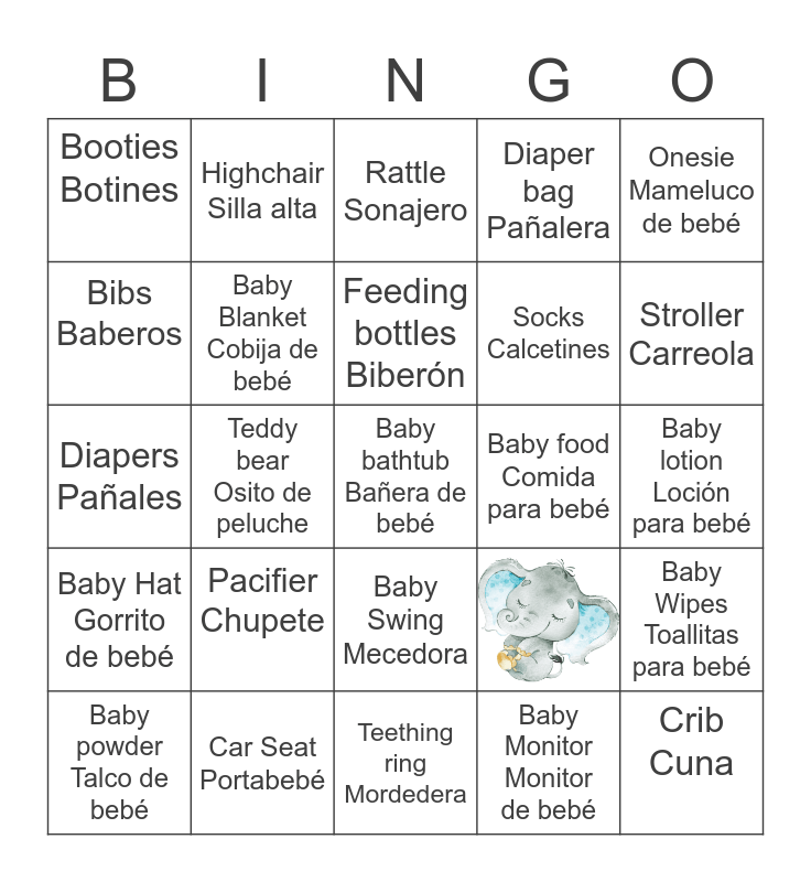 This bingo card has 1 images and 24 words: Pacifier Chupete, Teething ring Mordedera, Feeding bottles Biberón, Baby powder Talco de bebé, Onesie Mameluco de bebé, Booties Botines, Bibs Baberos, Highchair Silla alta, Baby food Comida para bebé, Baby Swing Mecedora, Socks Calcetines, Diapers Pañales, Baby Wipes Toallitas para bebé, Baby Blanket Cobija de bebé, Crib Cuna, Baby lotion Loción para bebé, Rattle Sonajero, Stroller Carreola, Teddy bear Osito de peluche, Baby bathtub Bañera de bebé, Car Seat Portabebé, Baby Hat Gorrito de bebé, Diaper bag Pañalera and Baby Monitor Monitor de bebé.