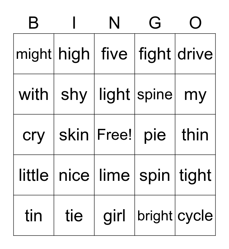 This bingo card has a free space and 24 words: nice, tie, light, tin, drive, might, with, high, pie, lime, spine, cry, spin, tight, shy, bright, thin, five, my, skin, cycle, little, fight and girl.