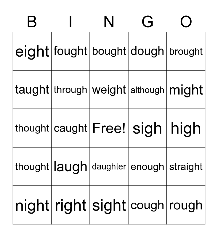 This bingo card has a free space and 24 words: laugh, right, weight, night, brought, eight, taught, fought, sigh, daughter, although, thought, enough, straight, through, cough, high, bought, might, caught, rough, thought, dough and sight.