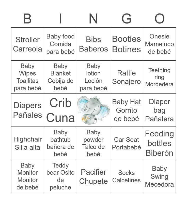 This bingo card has a free space and 24 words: Baby bathtub bañera de bebé, Teddy bear Osito de peluche, Baby lotion Loción para bebé, Baby Monitor Monitor de bebé, Onesie Mameluco de bebé, Stroller Carreola, Baby Wipes Toallitas para bebé, Baby food Comida para bebé, Baby Hat Gorrito de bebé, Baby powder Talco de bebé, Rattle Sonajero, Diapers Pañales, Car Seat Portabebé, Feeding bottles Biberón, Baby Blanket Cobija de bebé, Socks Calcetines, Diaper bag Pañalera, Bibs Baberos, Teething ring Mordedera, Crib Cuna, Baby Swing Mecedora, Highchair Silla alta, Booties Botines and Pacifier Chupete.