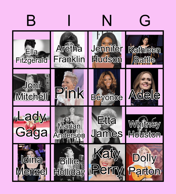 This bingo card has 16 images and 16 words: Billie Holliday, Whitney Houston, Jennifer Hudson, Ella Fitzgerald, Lady Gaga, Aretha Franklin, Etta James, Katy Perry, Joni Mitchell, Pink, Idina Menzel, Kathleen Battle, Marian Anderson, Adele, Beyonce and Dolly Parton.