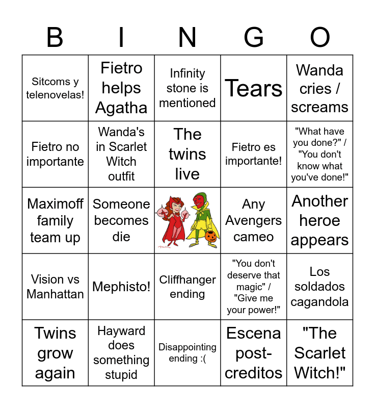 This bingo card has a free space and 40 words: Monica uses her powers, Maximoff family team up, Agatha vs Wanda, Wanda's in Scarlet Witch outfit, Hayward does something stupid, Cliffhanger ending, The twins live, The twins un-live, Wanda cries / screams, Vision vs Manhattan, Someone becomes die, Tears, "The Scarlet Witch!", Another heroe appears, Any Avengers cameo, Mephisto!, Another villain appears, Sitcoms y telenovelas!, Flashback time, Infinity stone is mentioned, Los soldados cagandola, Escena post-creditos, Fietro es importante!, Fietro no importante, Hex is destroyed, Hex is not destroyed, Kiss xoxo, Vision dies (again (again)), Wanda vs Manhattan, Vision vs Agatha, Monica joins the putiza, Twins grow again, Cp. Marvel / Dr. Strange reference /cameo, "You don't deserve that magic" / "Give me your power!", "What have you done?" / "You don't know what you've done!", Disappointing ending :(, Great ending :), Fietro helps Wanda, Fietro helps Agatha and Song.