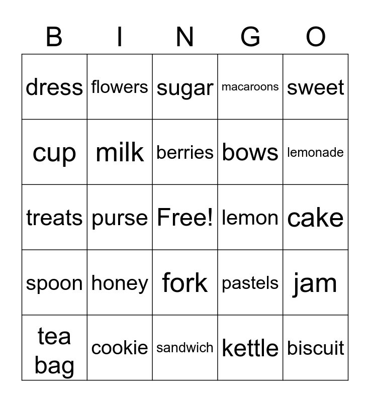 This bingo card has a free space and 29 words: tea bag, hat, purse, cupcake, dress, sugar, milk, honey, lemon, cookie, cake, biscuit, sandwich, kettle, lemonade, ice, fork, spoon, sweet, treats, pastels, fan, bows, cup, macaroons, flowers, jam, berries and gloves.