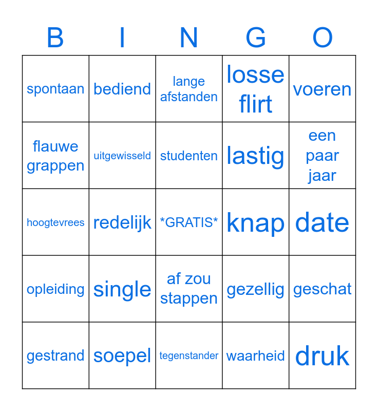 This bingo card has a free space and 24 words: single, soepel, studenten, gestrand, voeren, spontaan, flauwe grappen, bediend, knap, af zou stappen, lastig, hoogtevrees, gezellig, geschat, uitgewisseld, waarheid, date, lange afstanden, een paar jaar, redelijk, druk, opleiding, losse flirt and tegenstander.