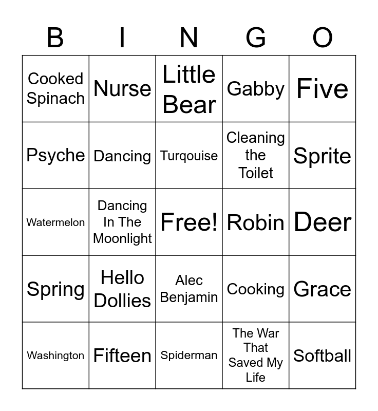 This bingo card has a free space and 24 words: Hello Dollies, Fifteen, Turqouise, Washington, Five, Cooked Spinach, Psyche, Nurse, Robin, Alec Benjamin, Cleaning the Toilet, Watermelon, Cooking, Grace, Dancing, The War That Saved My Life, Deer, Little Bear, Sprite, Dancing In The Moonlight, Softball, Spring, Gabby and Spiderman.