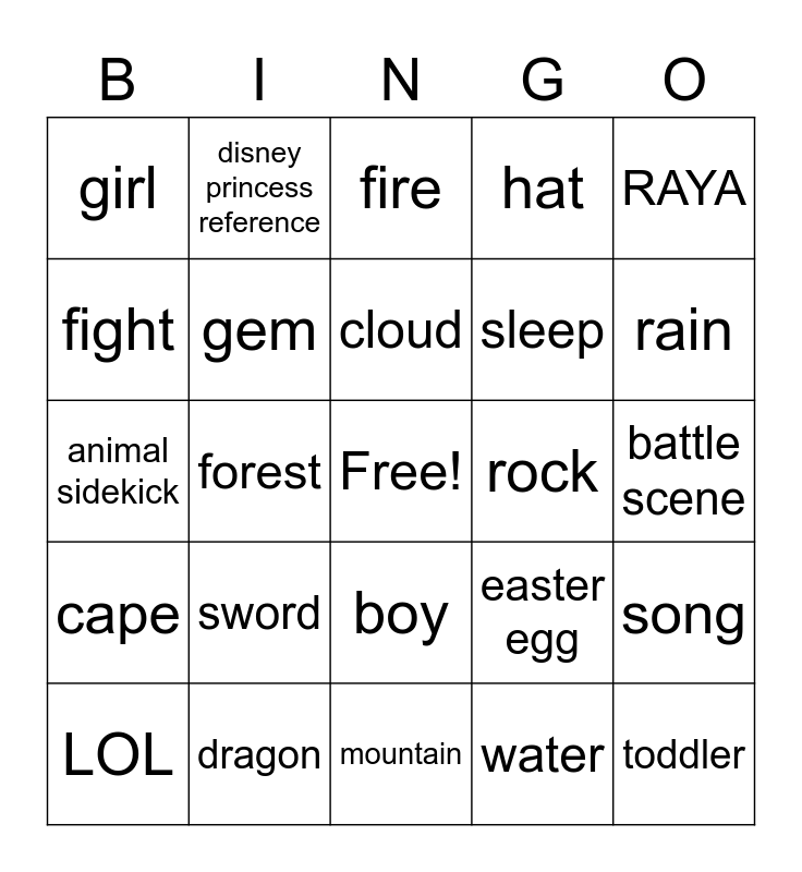 This bingo card has a free space and 24 words: sword, dragon, cloud, LOL, RAYA, girl, fight, disney princess reference, rock, boy, sleep, animal sidekick, easter egg, song, gem, water, battle scene, fire, rain, forest, toddler, cape, hat and mountain.