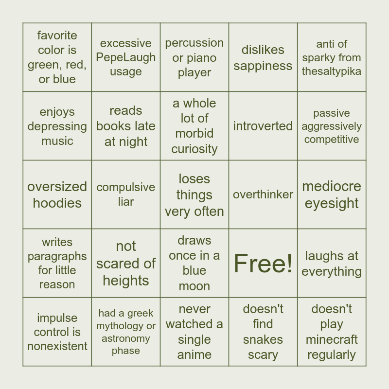 This bingo card has 25 words: not scared of heights, never watched a single anime, a whole lot of morbid curiosity, impulse control is nonexistent, anti of sparky from thesaltypika, favorite color is green, red, or blue, enjoys depressing music, excessive PepeLaugh usage, overthinker, draws once in a blue moon, introverted, oversized hoodies, Free!, laughs at everything, reads books late at night, doesn't play minecraft regularly, mediocre eyesight, percussion or piano player, passive aggressively competitive, compulsive liar, loses things very often, had a greek mythology or astronomy phase, writes paragraphs for little reason, dislikes sappiness and doesn't find snakes scary.