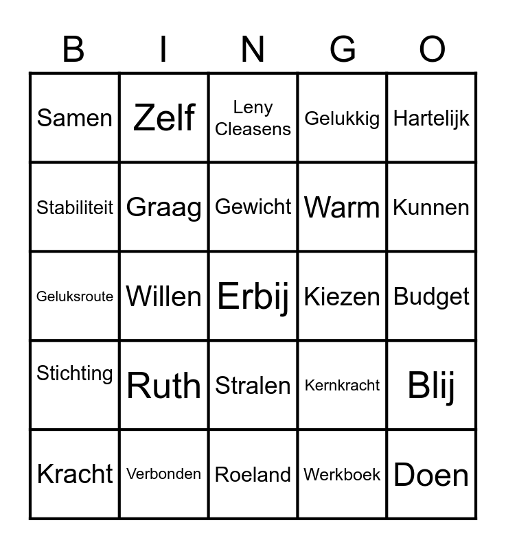 This bingo card has 25 words: Ruth, Roeland, Gewicht, Kracht, Hartelijk, Samen, Stabiliteit, Zelf, Kiezen, Stralen, Warm, Geluksroute, Kernkracht, Blij, Graag, Doen, Budget, Leny Cleasens, Kunnen, Willen, Erbij, Verbonden, Stichting, Gelukkig and Werkboek.