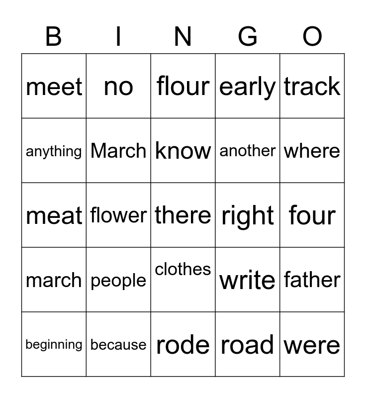 This bingo card has a free space and 24 words: people, because, know, beginning, track, meet, anything, no, right, clothes, another, meat, write, father, March, road, four, flour, where, flower, were, march, early and rode.