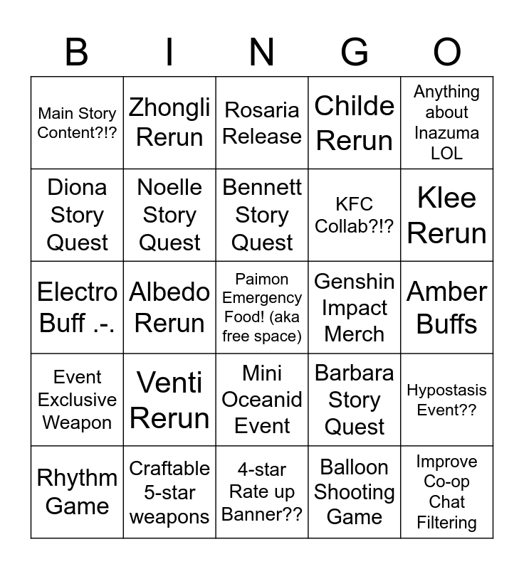 This bingo card has a free space and 24 words: Venti Rerun, Craftable 5-star weapons, Bennett Story Quest, Rhythm Game, Anything about Inazuma LOL, Main Story Content?!?, Diona Story Quest, Zhongli Rerun, Genshin Impact Merch, Mini Oceanid Event, KFC Collab?!?, Electro Buff .-., Barbara Story Quest, Hypostasis Event??, Noelle Story Quest, Balloon Shooting Game, Amber Buffs, Rosaria Release, Klee Rerun, Albedo Rerun, Improve Co-op Chat Filtering, Event Exclusive Weapon, Childe Rerun and 4-star Rate up Banner??.
