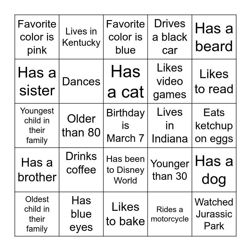 This bingo card has a free space and 24 words: Drinks coffee, Has blue eyes, Has a cat, Oldest child in their family, Has a beard, Favorite color is pink, Has a sister, Lives in Kentucky, Lives in Indiana, Has been to Disney World, Likes video games, Youngest child in their family, Younger than 30, Has a dog, Dances, Rides a motorcycle, Eats ketchup on eggs, Favorite color is blue, Likes to read, Older than 80, Watched Jurassic Park, Has a brother, Drives a black car and Likes to bake.