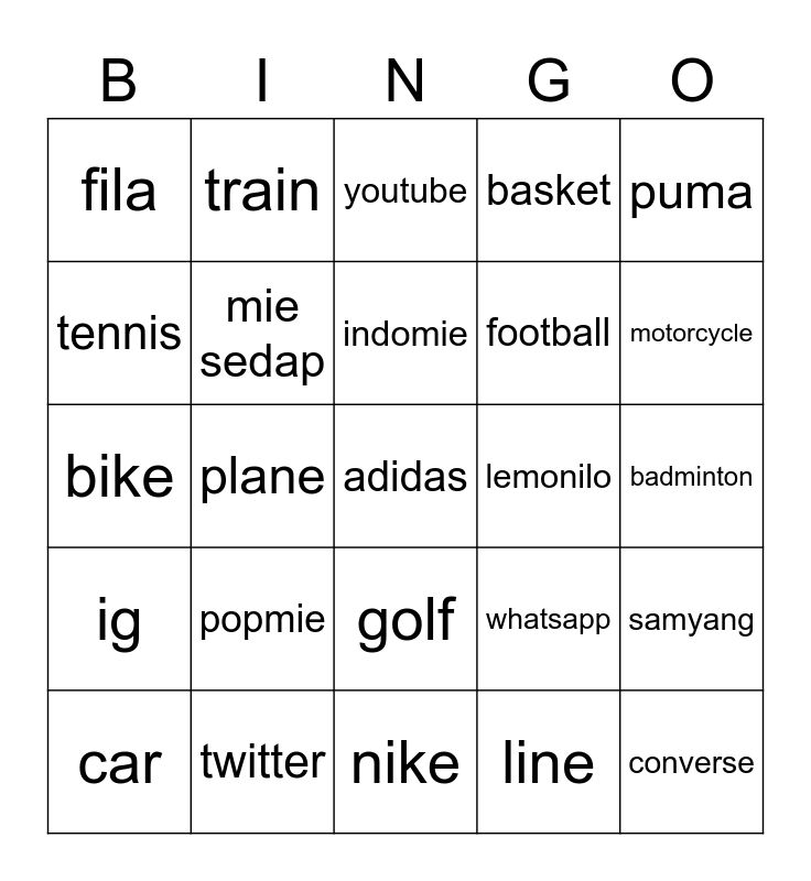 This bingo card has a free space and 24 words: popmie, twitter, indomie, car, puma, fila, tennis, train, lemonilo, golf, football, bike, whatsapp, samyang, mie sedap, line, badminton, youtube, motorcycle, plane, converse, ig, basket and nike.
