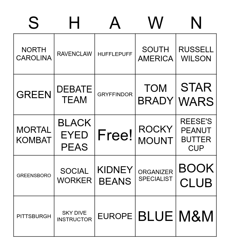 This bingo card has a free space and 24 words: SOCIAL WORKER, SKY DIVE INSTRUCTOR, GRYFFINDOR, PITTSBURGH, RUSSELL WILSON, NORTH CAROLINA, GREEN, RAVENCLAW, ROCKY MOUNT, KIDNEY BEANS, TOM BRADY, MORTAL KOMBAT, ORGANIZER SPECIALIST, BOOK CLUB, DEBATE TEAM, BLUE, REESE'S PEANUT BUTTER CUP, HUFFLEPUFF, STAR WARS, BLACK EYED PEAS, M&M, GREENSBORO, SOUTH AMERICA and EUROPE.