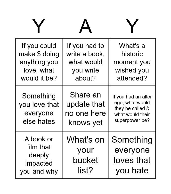 This bingo card has a free space and 14 words: An experience that changed your perspective on life (that no one else knows), Something people get wrong about you, A book or film that deeply impacted you and why, If you had to write a book, what would you write about?, Something you love that everyone else hates, Something everyone loves that you hate, How have you grown most this past year?, Show us what your kitchen looks like right now, What's on your bucket list?, If you could make $ doing anything you love, what would it be?, What's a skill you could teach the rest of us in this group to do?, If you had an alter ego, what would they be called & what would their superpower be?, What's a historic moment you wished you attended? and What did you learn about money from your family?.