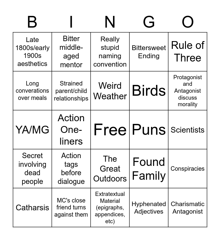This bingo card has a free space and 24 words: Action tags before dialogue, MC's close friend turns against them, Weird Weather, Catharsis, Rule of Three, Late 1800s/early 1900s aesthetics, Long converations over meals, Bitter middle-aged mentor, Puns, The Great Outdoors, Birds, YA/MG, Found Family, Conspiracies, Strained parent/child relationships, Hyphenated Adjectives, Scientists, Really stupid naming convention, Protagonist and Antagonist discuss morality, Action One-liners, Charismatic Antagonist, Secret involving dead people, Bittersweet Ending and Extratextual Material (epigraphs, appendices, etc).