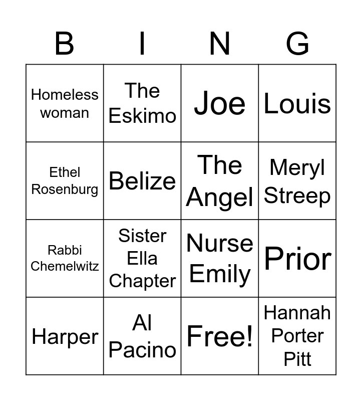 This bingo card has 17 words: Free!, Harper, Joe, Homeless woman, Sister Ella Chapter, Louis, Prior, The Angel, Meryl Streep, Belize, Al Pacino, Nurse Emily, Ethel Rosenburg, The Eskimo, Rabbi Chemelwitz, Mr. Lies and Hannah Porter Pitt.