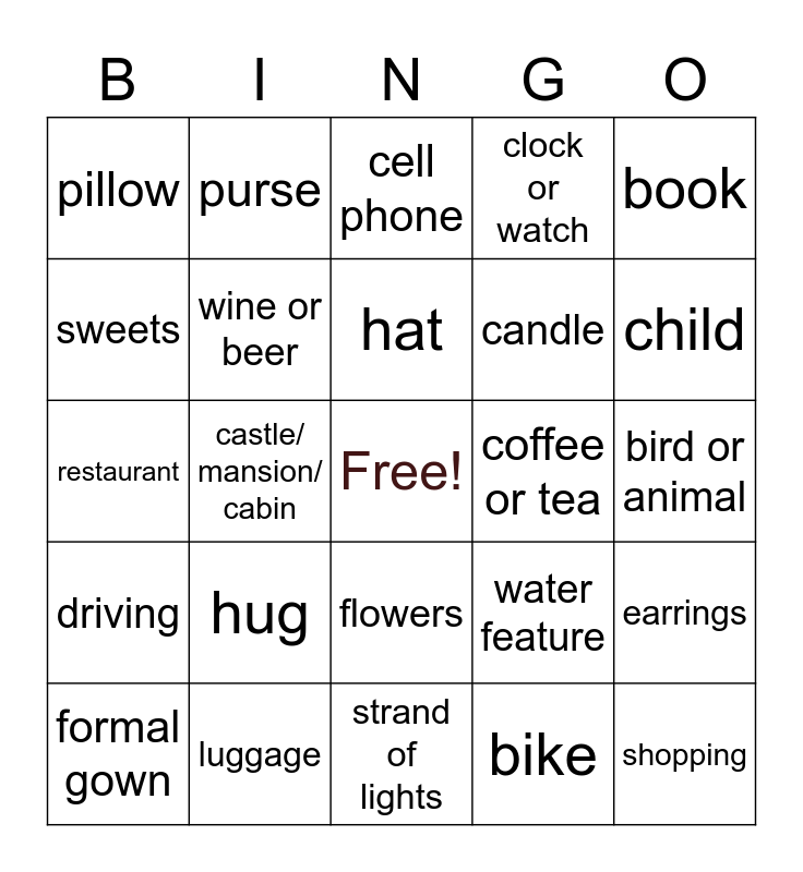 This bingo card has a free space and 29 words: formal gown, necklace, castle/ mansion/ cabin, office desk, pillow, cell phone, wine or beer, hug, coffee or tea, luggage, bird or animal, shopping, strand of lights, bike, child, kiss, flowers, driving, book, restaurant, water feature, lamp, candle, sweets, clock or watch, purse, earrings, hat and hair adornment.