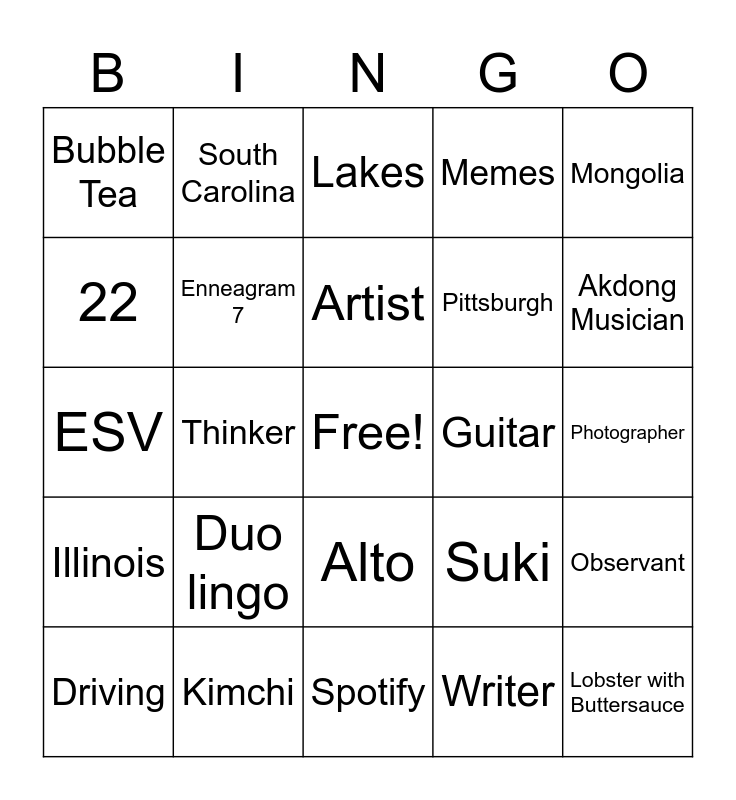 This bingo card has a free space and 24 words: Duo lingo, Kimchi, Artist, Driving, Mongolia, Bubble Tea, 22, South Carolina, Guitar, Alto, Pittsburgh, ESV, Suki, Observant, Enneagram 7, Writer, Photographer, Lakes, Akdong Musician, Thinker, Lobster with Buttersauce, Illinois, Memes and Spotify.