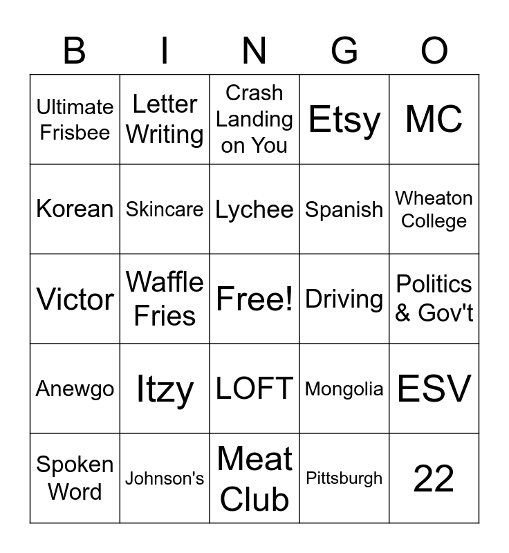 This bingo card has a free space and 24 words: Itzy, Johnson's, Lychee, Spoken Word, MC, Ultimate Frisbee, Korean, Letter Writing, Driving, LOFT, Spanish, Victor, Mongolia, ESV, Skincare, Pittsburgh, Politics & Gov't, Crash Landing on You, Wheaton College, Waffle Fries, 22, Anewgo, Etsy and Meat Club.