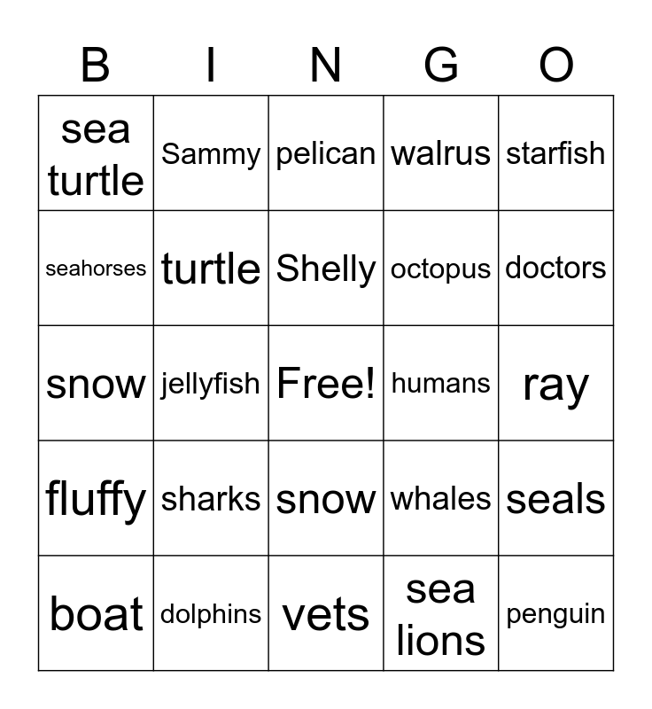 This bingo card has a free space and 24 words: sharks, dolphins, Shelly, boat, starfish, sea turtle, seahorses, Sammy, humans, snow, octopus, snow, whales, seals, turtle, sea lions, ray, pelican, doctors, jellyfish, penguin, fluffy, walrus and vets.